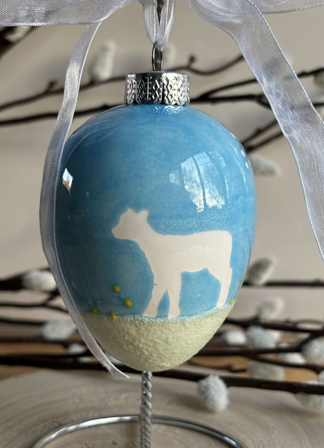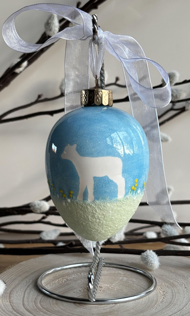 8cm Handmade Egg showing Two Lambs - choice of silver or gold bauble cap